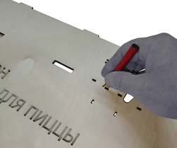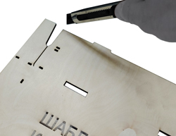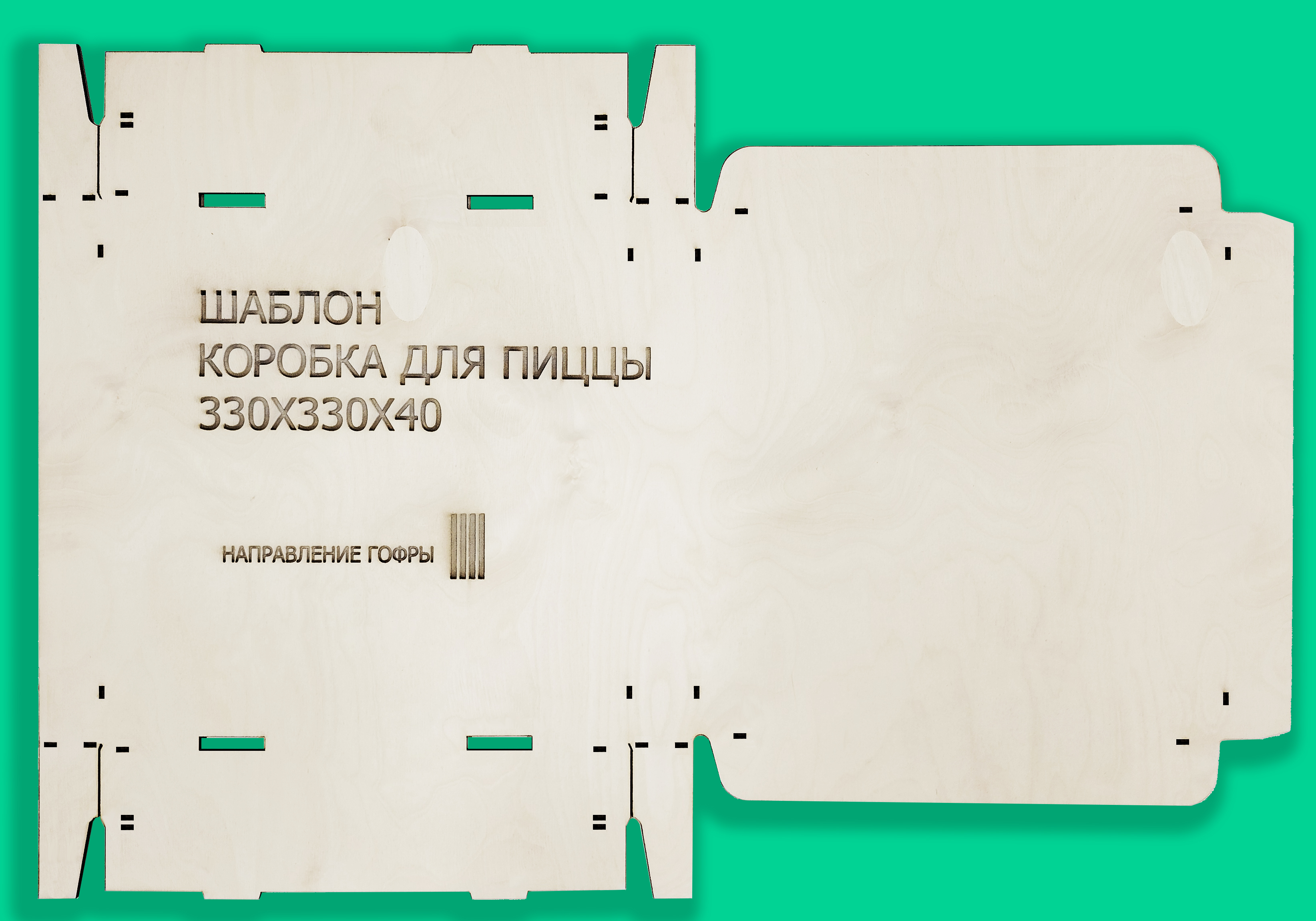 Шаблон четырехугольной коробки для пиццы размером 330х330х40мм. Шаблон спроектирован для картона толщиной 3мм. Шаблон сделан из шлифованной фанеры толщиной 3мм и покрыт лаком. |